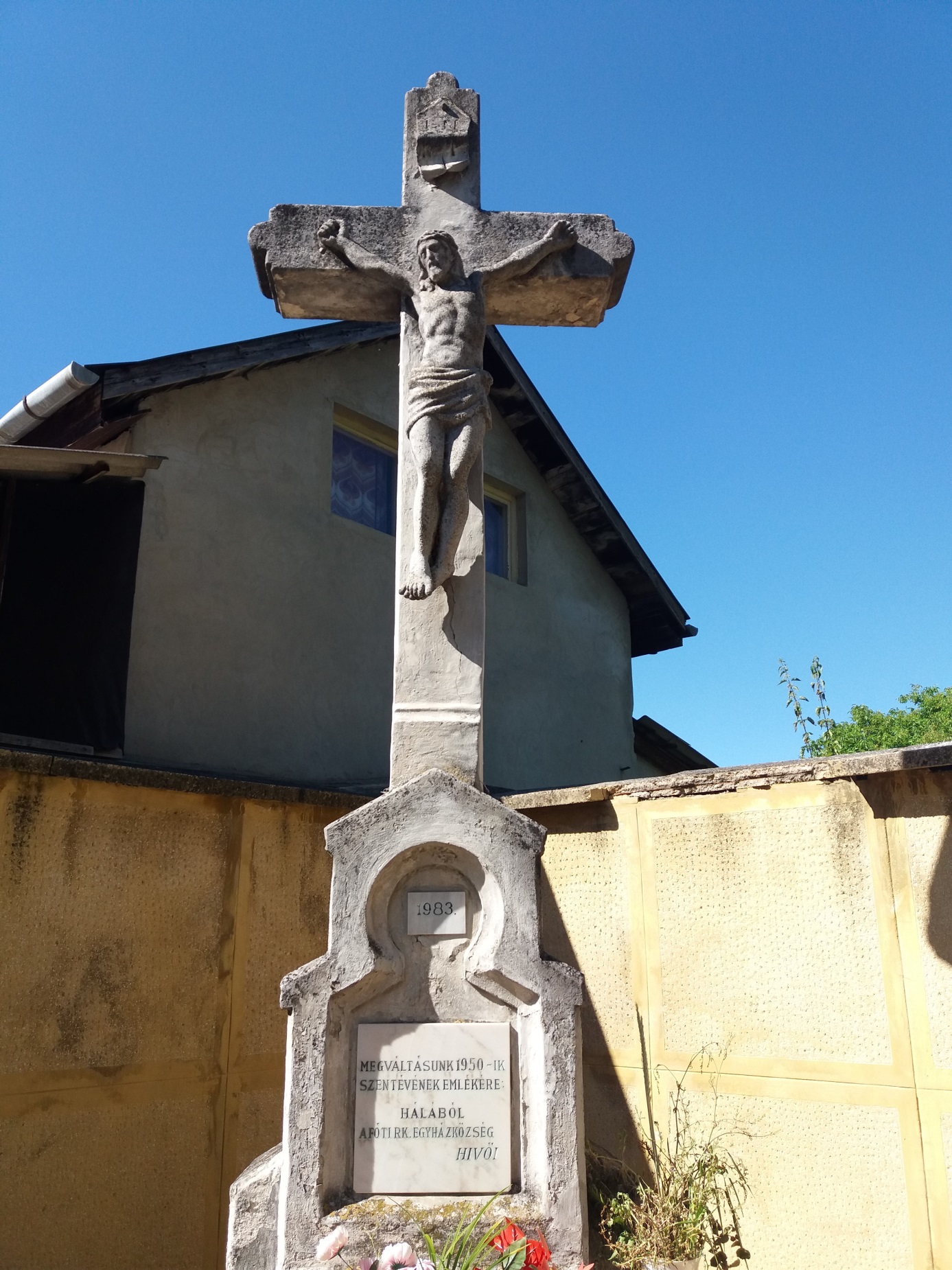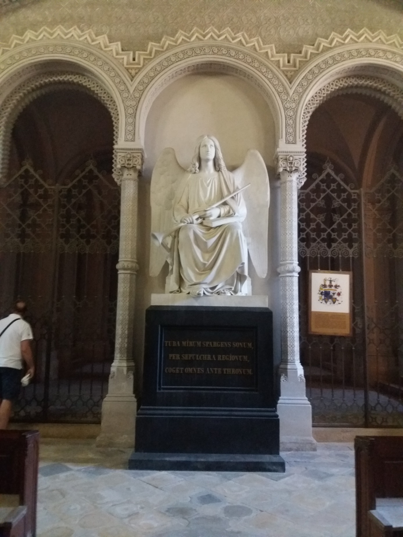 A Jézus szoborral szemben ott áll az angyal, aki megfújja a harsonát.